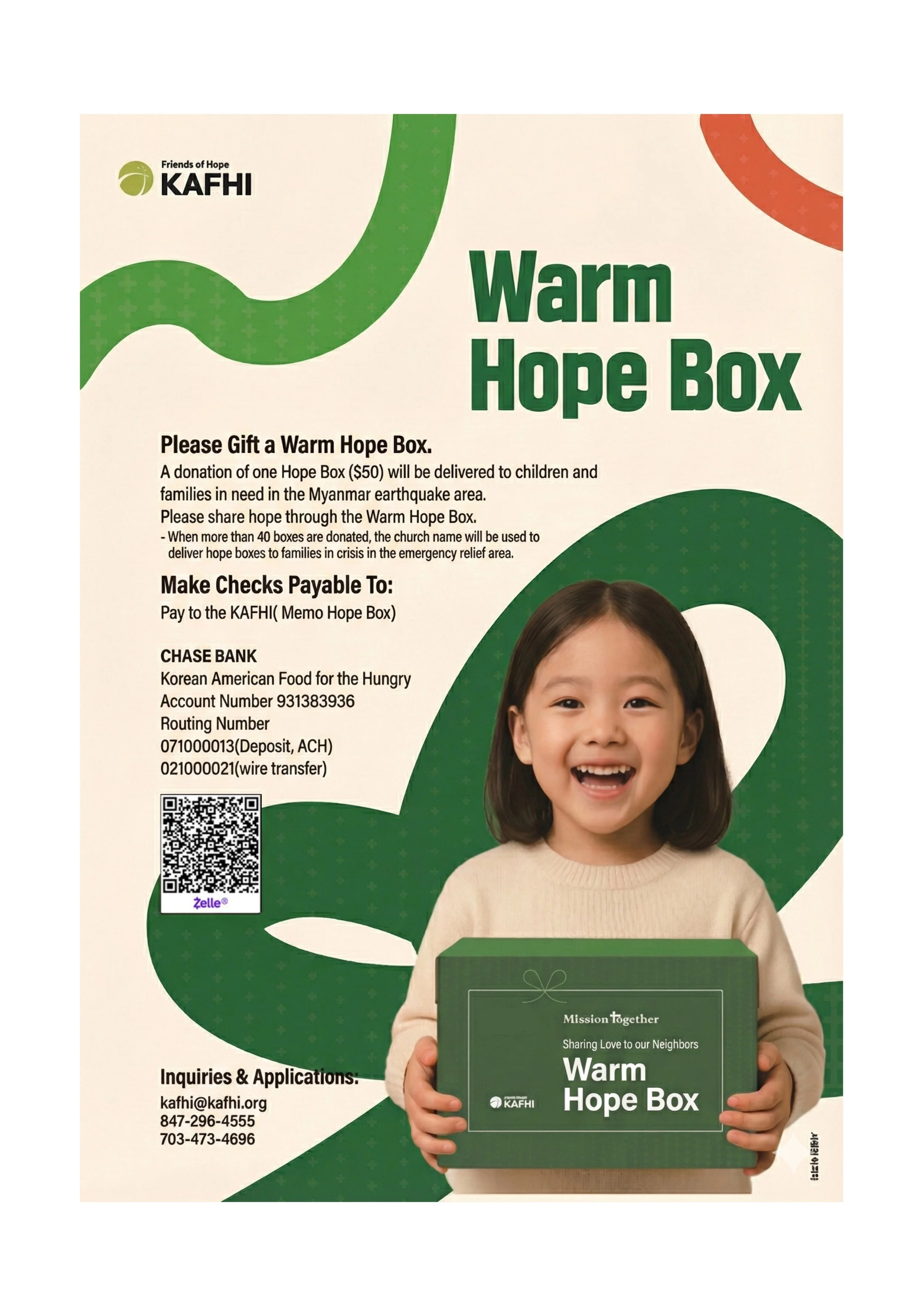 연말 연시를 맞아 KAFHI(미주기아대책)는 미얀마 지진 피해로 고통받는 취약 계층 가정을 지원하기 위한 캠페인을 시작합니다.